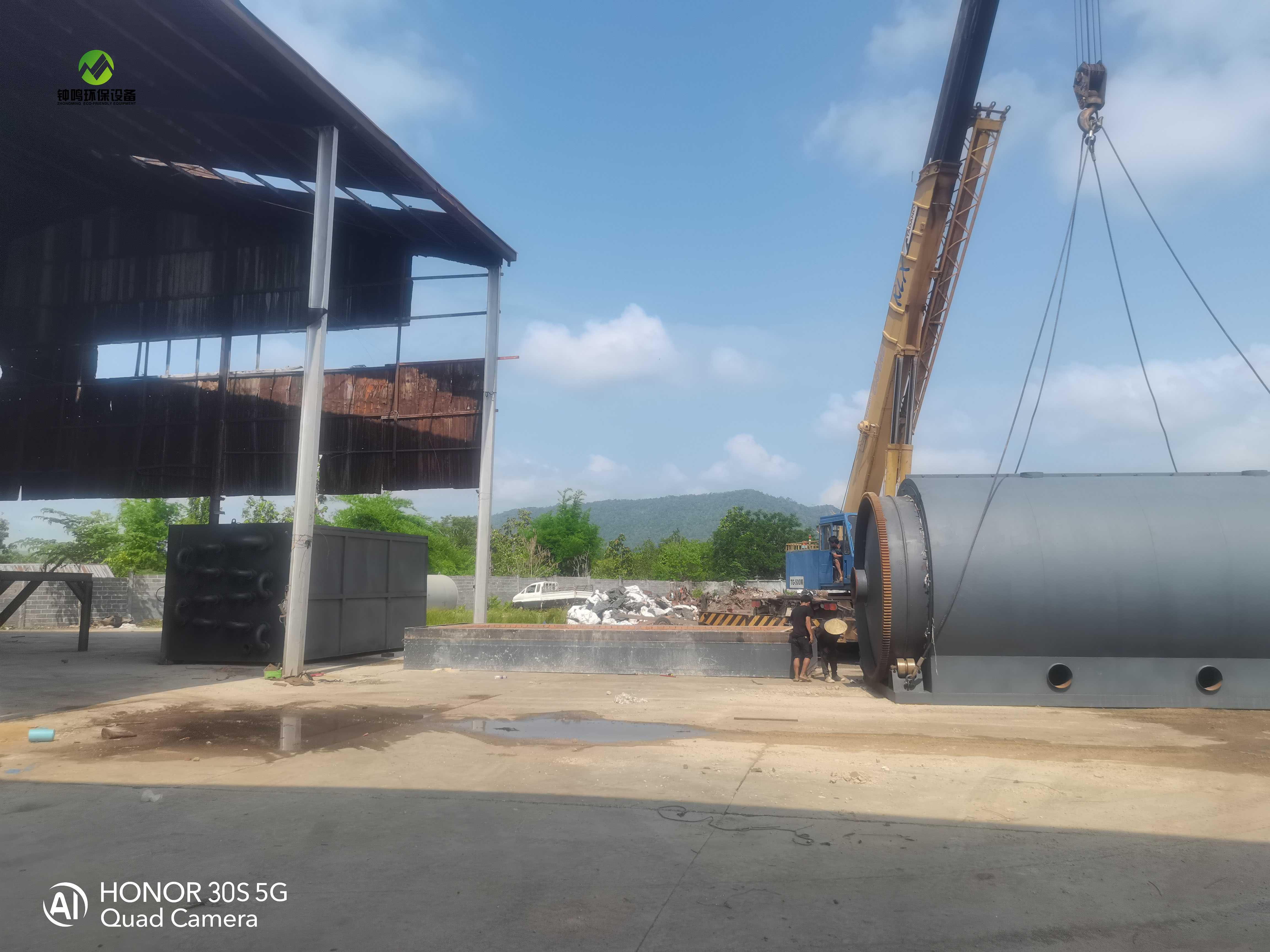 第 1 步:上料 ---- 用抓機把廢舊輪胎放在液壓上料器料斗中,通過自控式液壓上料器自動進入裂解爐中,上料結束后關閉上料門。